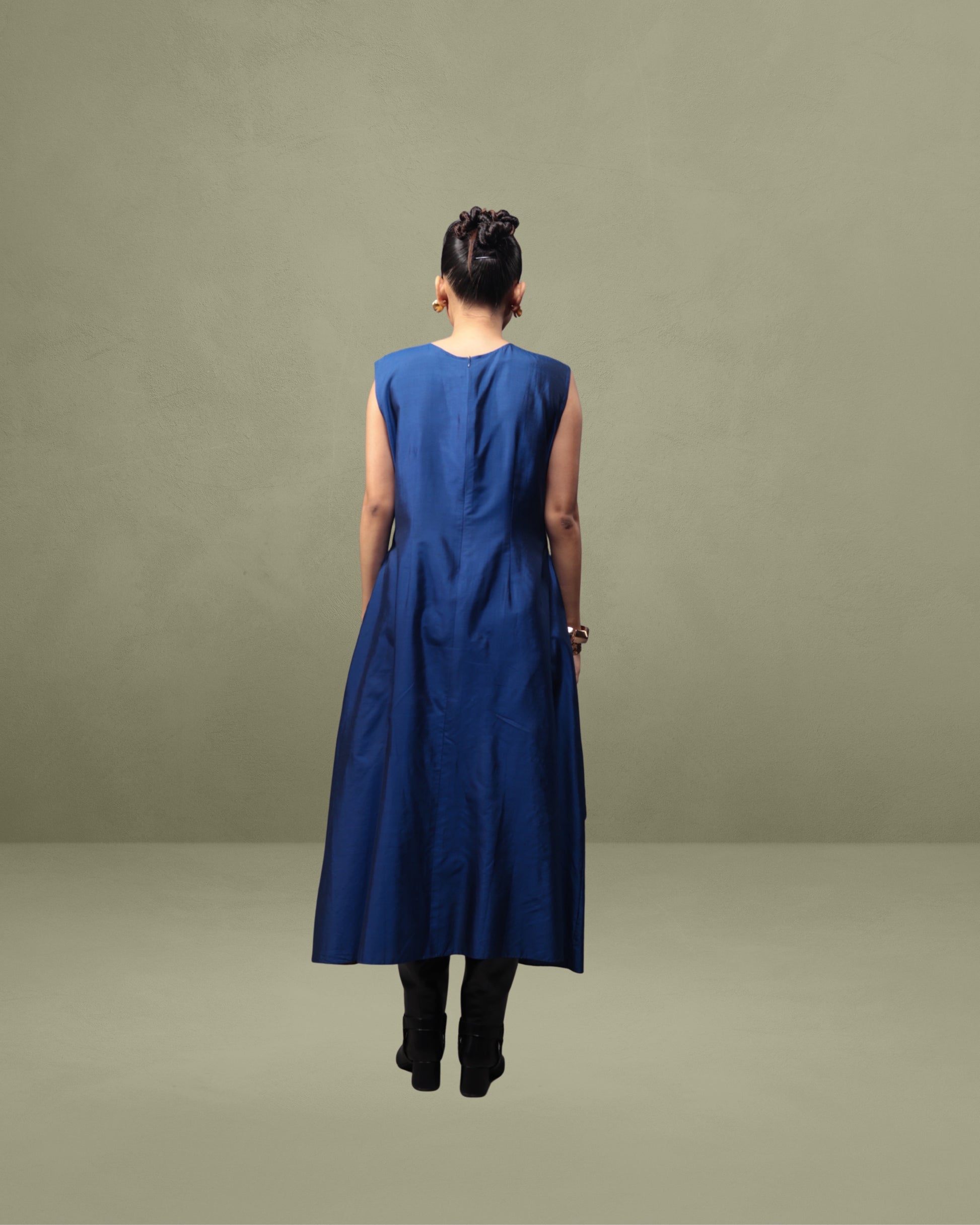 This Dress is designed with a fluid asymmetric hemline and clean, structured shoulders. Sleeveless and relaxed, the dress allows movement and breathability, while the constructed shape ensures the creative color blocking.