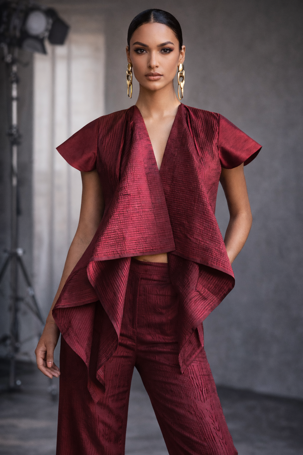 Crafted in richly textured pure silk, this statement co-ord set features a sculptural draped top with cascading panels and cap sleeves. Paired with relaxed straight-leg silk pants. The silhouette is fluid yet refined, appropriate for intimate celebrations and elevated evenings.