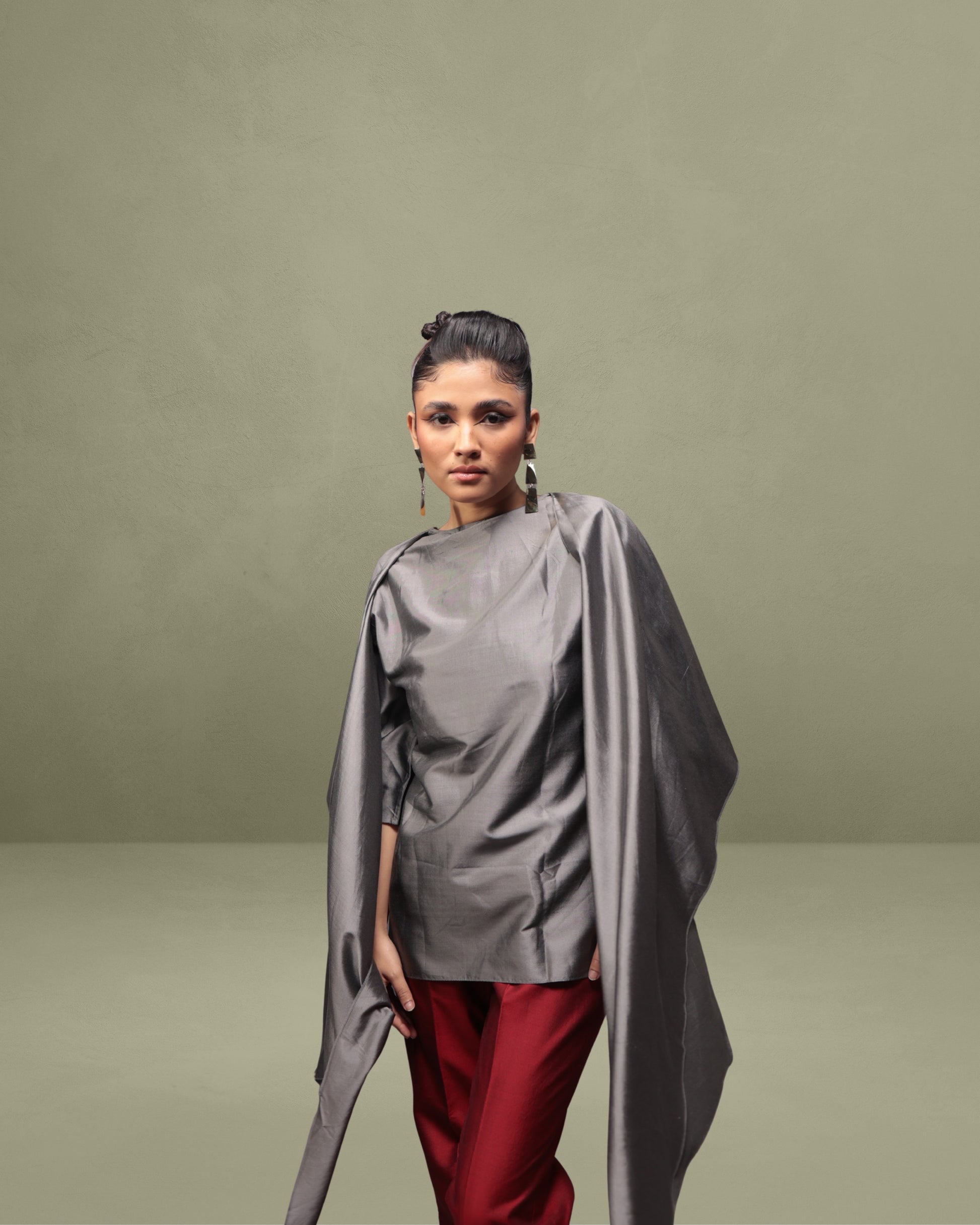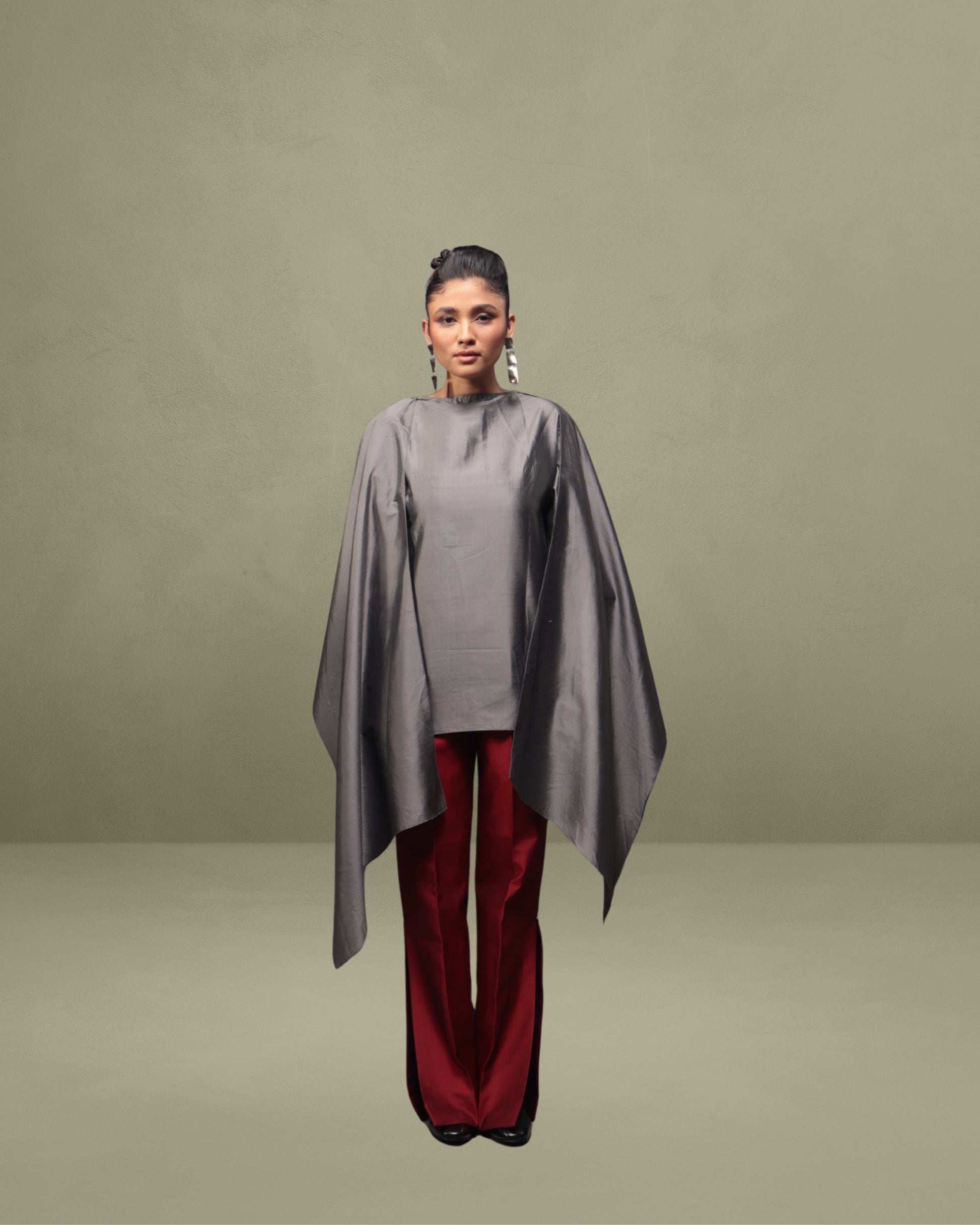 Featuring a round neckline top with elbow-length sleeves, it offers dramatic shoulder drapes that let you style it your way, flowing freely, wrapped, or belted for a more sculpted silhouette. paired with our signature high-waisted bootcut pants for a bold yet graceful look. Perfect for cocktail evenings, art openings etc.
